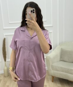 Pyjama Boutonnée demi-manche en satin » Mauve » à rayures